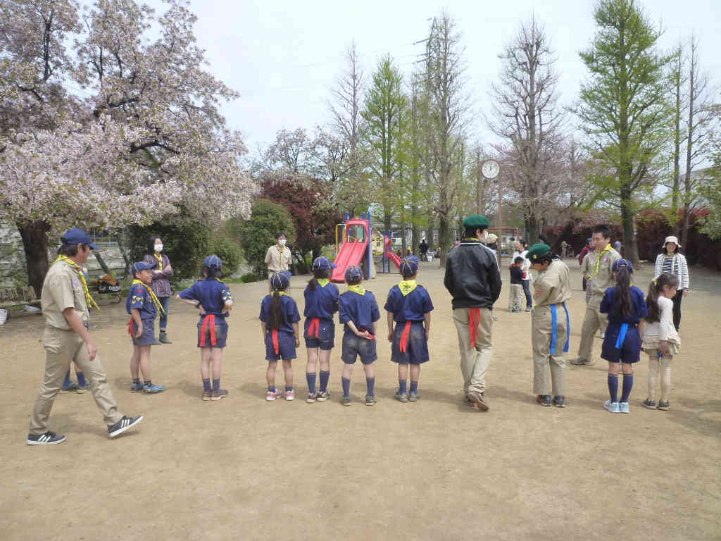 4月13日(日)隊集会、今日の活動は「チームワークゲーム」です。小学校三年生の子も体験入隊で参加してくれました。これから5つの組対抗ゲームで競い合います。団結力・作戦会議が勝敗を左右するぞ!