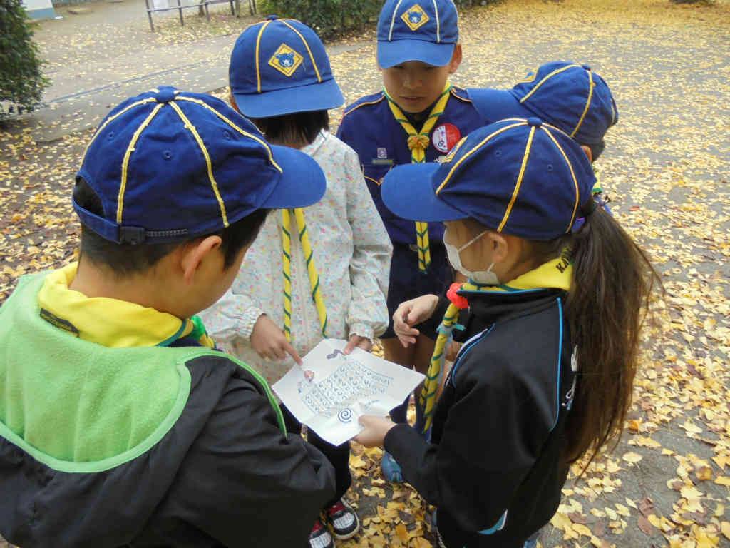 11月22日(日)隊集会。今日は、3種類の暗号文を解読しながらゲームを競い合います。暗号文には「組対抗ゲーム」の内容が書かれているぞ!