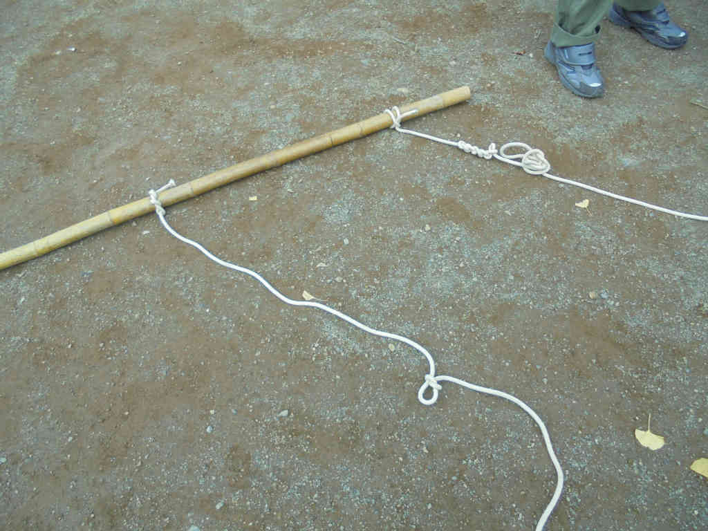 3種類の暗号文を解読したスカウト達、木の棒・石・ひもの3つのアイテムを手に入れました。アイテムを組み立てると・・・斧に大変身。