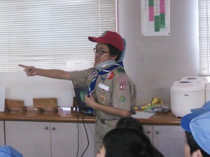 12:45、この夏ボルチモア派遣隊として参加したIベンチャースカウトから体験の報告がありました。アメリカの話、日本文化との違い、銃やカヌー・アーチェリー・キャンプ・食事・ショッピング等々、ビーバー・カブスカウト達は、興味を示していました(たくさん質問していましたね)。
