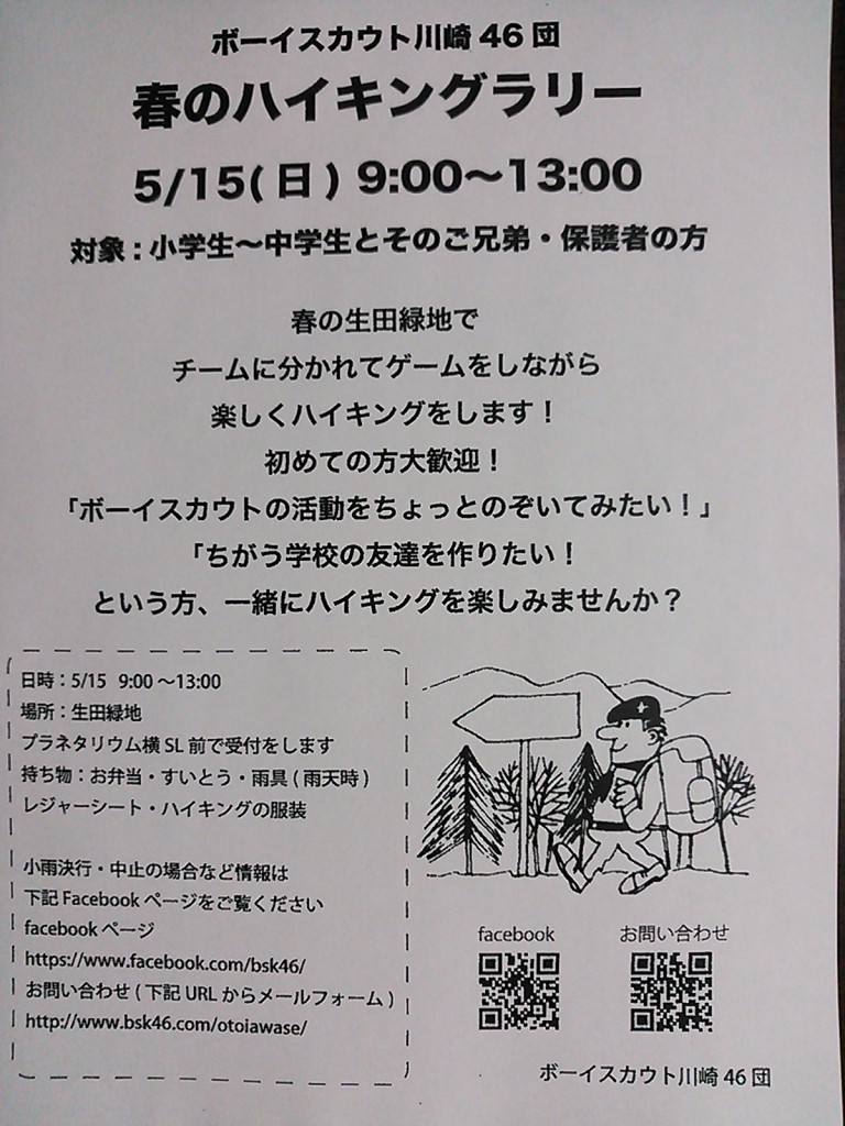 「ボーイスカウトの活動をちょっとのぞいてみたい!」、「ちがう学校の友だちを作りたい!」という方、一緒にハイキングを楽しみませんか?