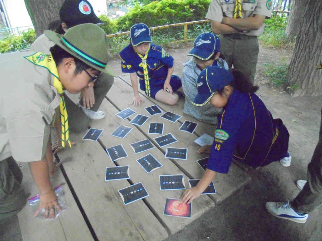 2つ目のプログラム、「太陽系惑星カードゲーム=神経衰弱」です。恒星・惑星・衛星の写真と写真説明カードがセットです。当たったスカウトは、自分が取ったカードの説明文を読んでみんなに聞かせて下さい。