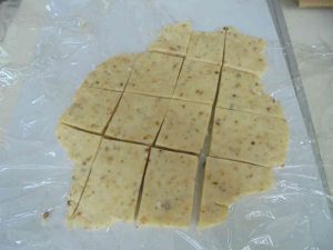 手を洗ってボールに小麦粉、水・油を入れて混ぜます。木の実(くるみ・ピスタチオ(どんぐりのかわり))を混ぜて生地を伸ばしましょう。