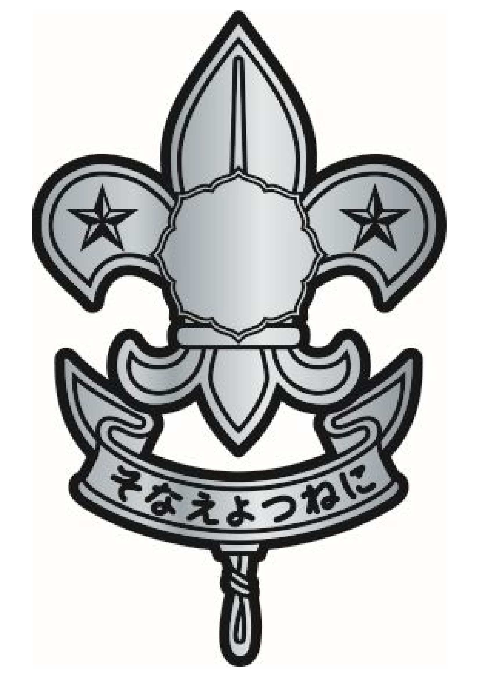 上の図:全体の形は、ゆりの花の形をしていますが、これはむかしの航海者が使っていたコンパスの磁針の北をさす部分の形からとったものです。またコンパスが正しい方角をいつでも示すように、スカウトも正しい人生を進みます。そして、ゆりは愛を表し、スカウトのサインと同じようにスカウトの三つのちかいの意味も表しています。