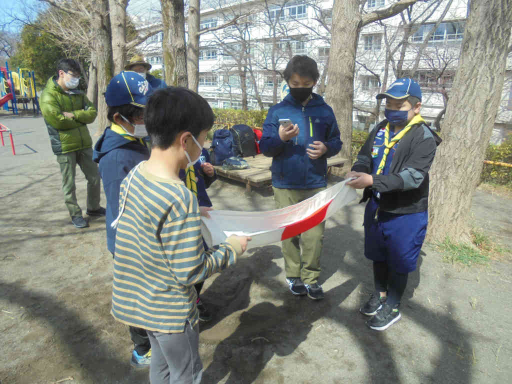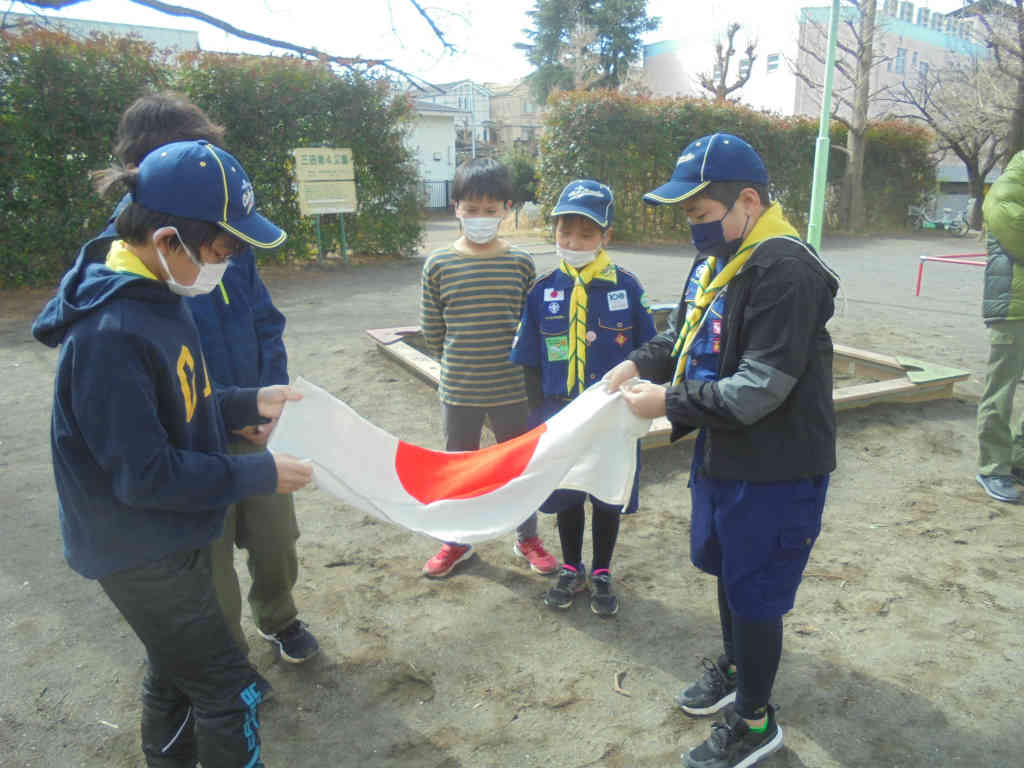 3月20日(日)隊集会、体験活動を経て新しい仲間が加わります。先輩は、カブスカウトのサインやソング、基本動作、なわ結び、国旗のたたみ方などを教えてあげましょう。