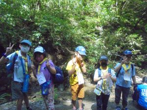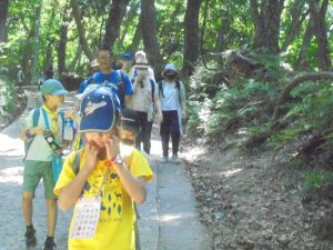 山頂では、2つ目のミッション、山頂から富士山の位置を調べました。「前回隊集会、方位と方位磁石の使い方を覚えましたね。富士山はどっち方向でしたか?」(リーダー)、「西方向です」(スカウト)。