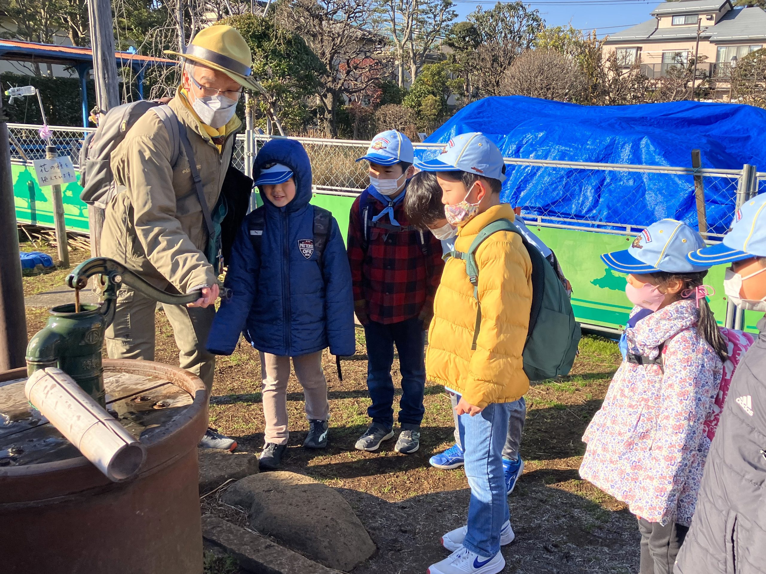 「泉龍寺」から「むいから民家園」へ。手押しポンプで井戸水をくみあげてみよう。