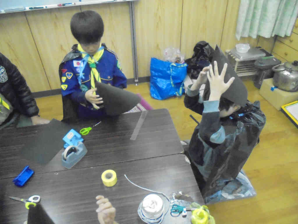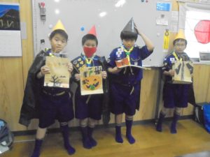 10月15日(日)隊集会のテーマは、「ハロウィンパーティー準備」です。パーティー本番に向けて仮装3点セット、①マント、②ハット、③お菓子袋を作りますよ!