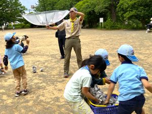 「しんぶんし」で玉をつくって、玉入れするよ。さあさあ、ねらって! たくさん入ったね。