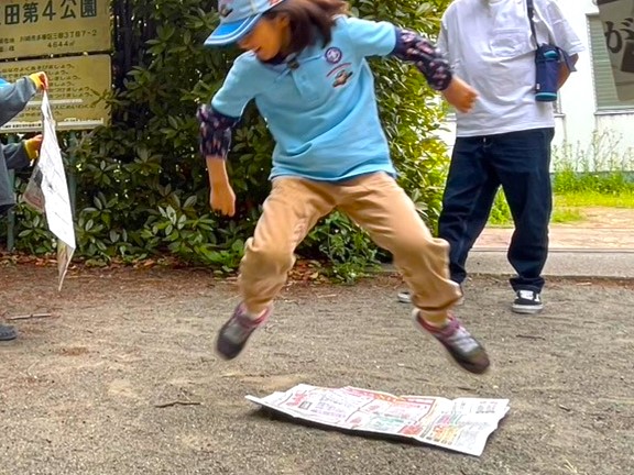 「しんぶんし」をふまないようにジャンプできるかな。「しんぶんし」をおとさないではしりつづけることができるかな。