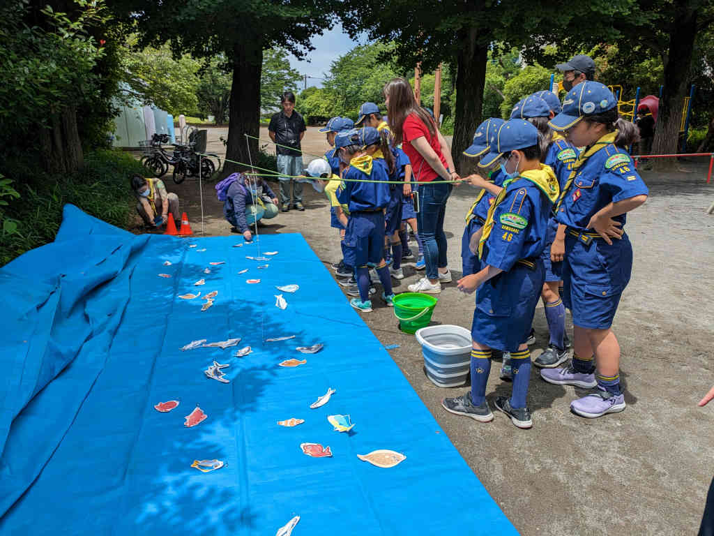 来週のザリガニ釣りに向けて事前に海水魚・淡水魚の名前や釣り道具の手入れ方法、釣りのマナー、投げ釣りの練習などゲームをしたがら学びました。