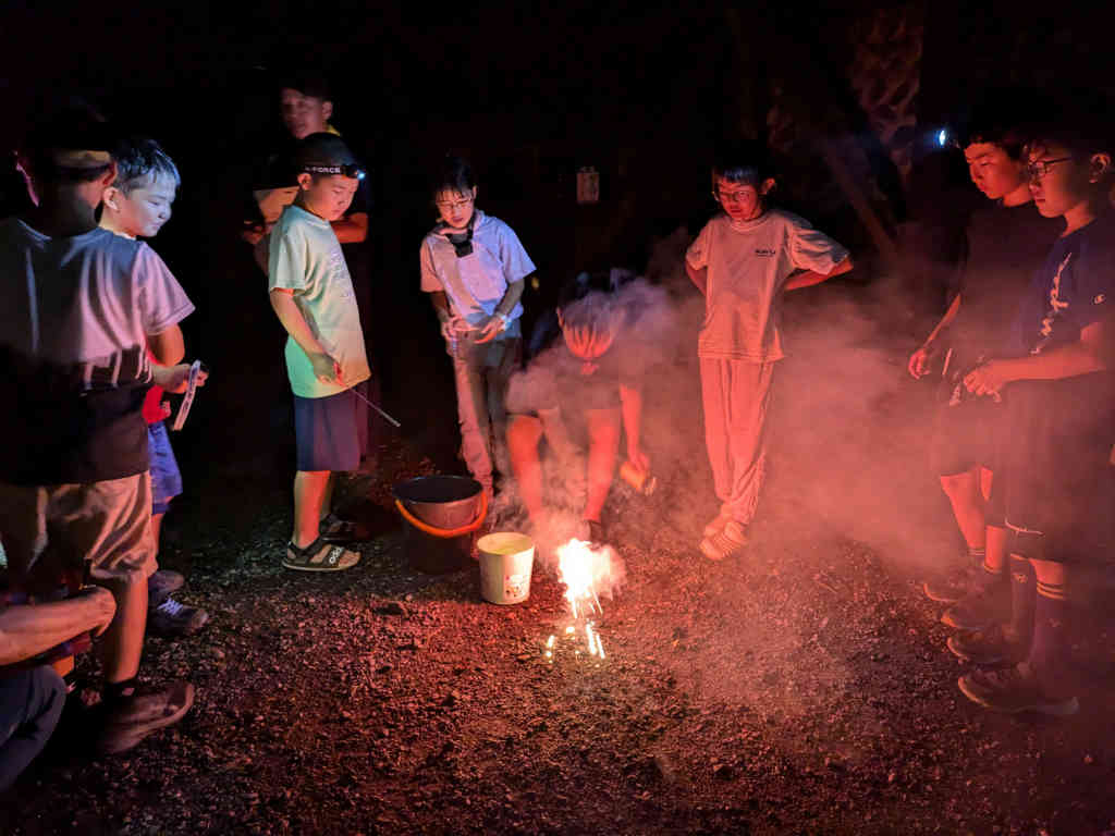 ニジマス掴み取りの後は、川遊びにゲーム(整列訓練・国旗たたみスピード対決・猛獣退治(フリスビー的当て))です。