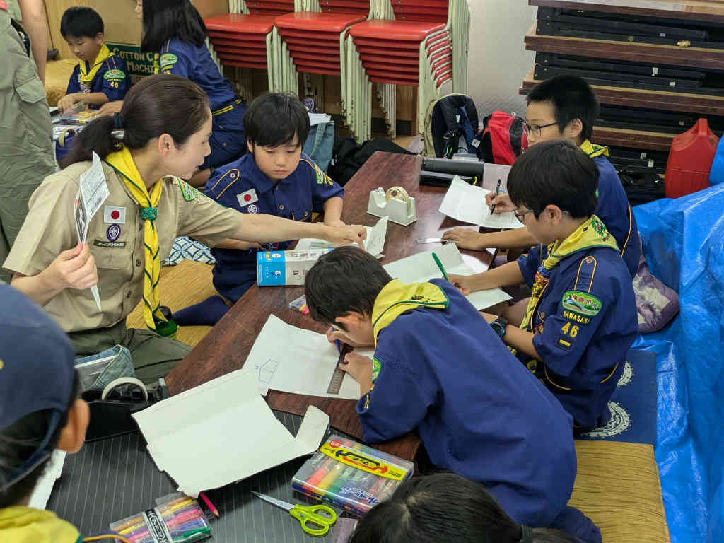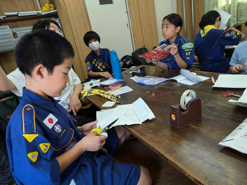 9月15日(日)隊集会、テーマは工作(牛乳パック飛行機)です。①製図を書く,②カット,③組立,④飛行(誰が一番飛んだかな?)を体験します。