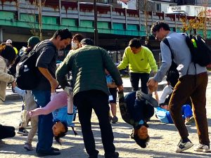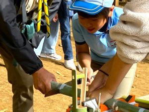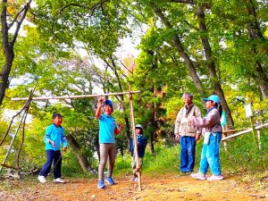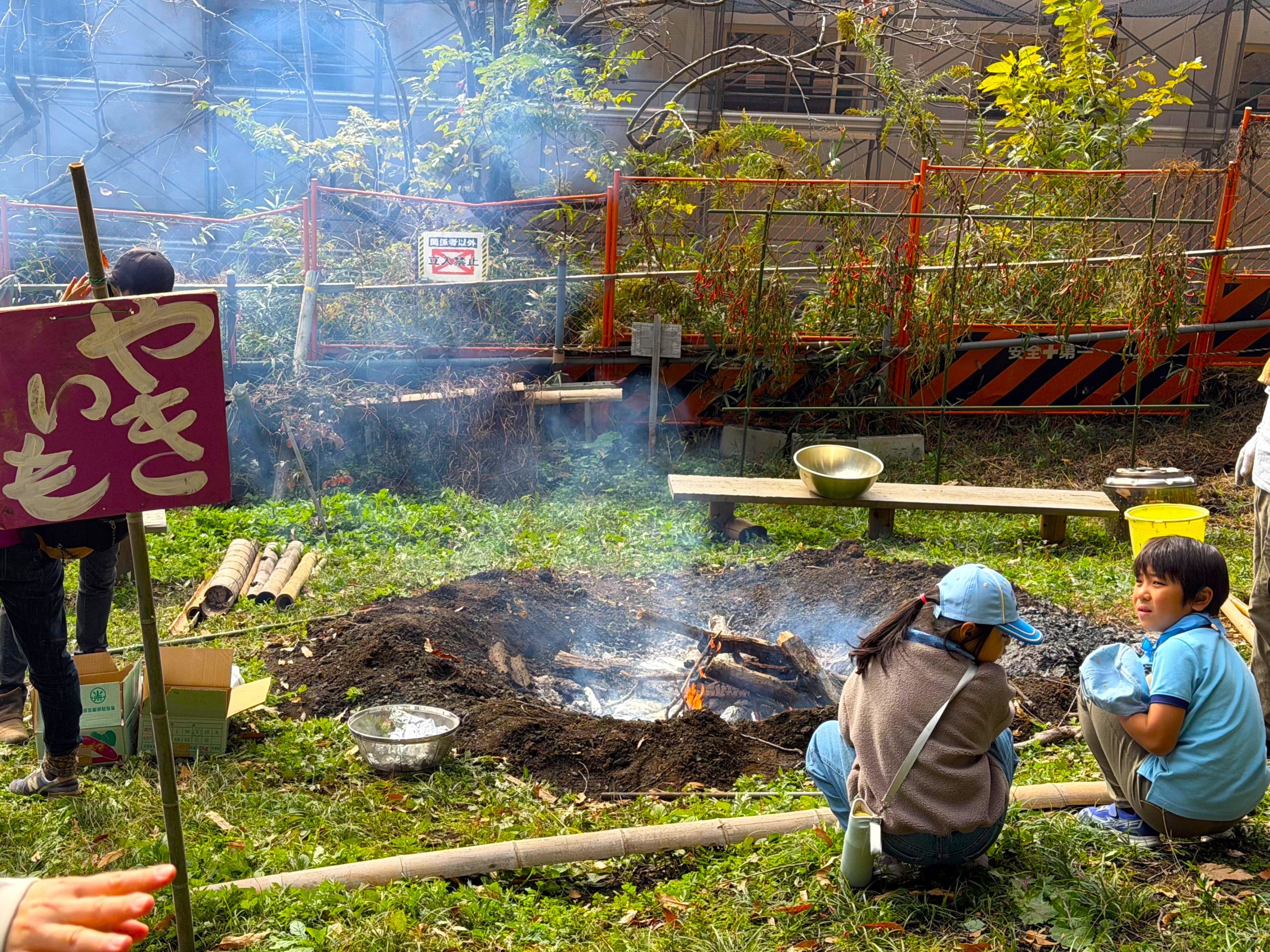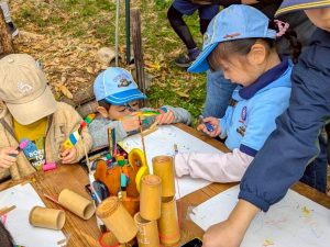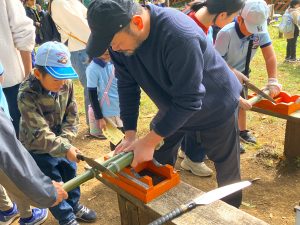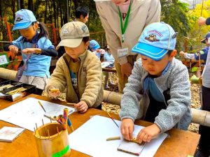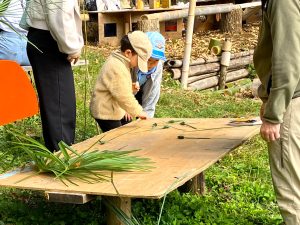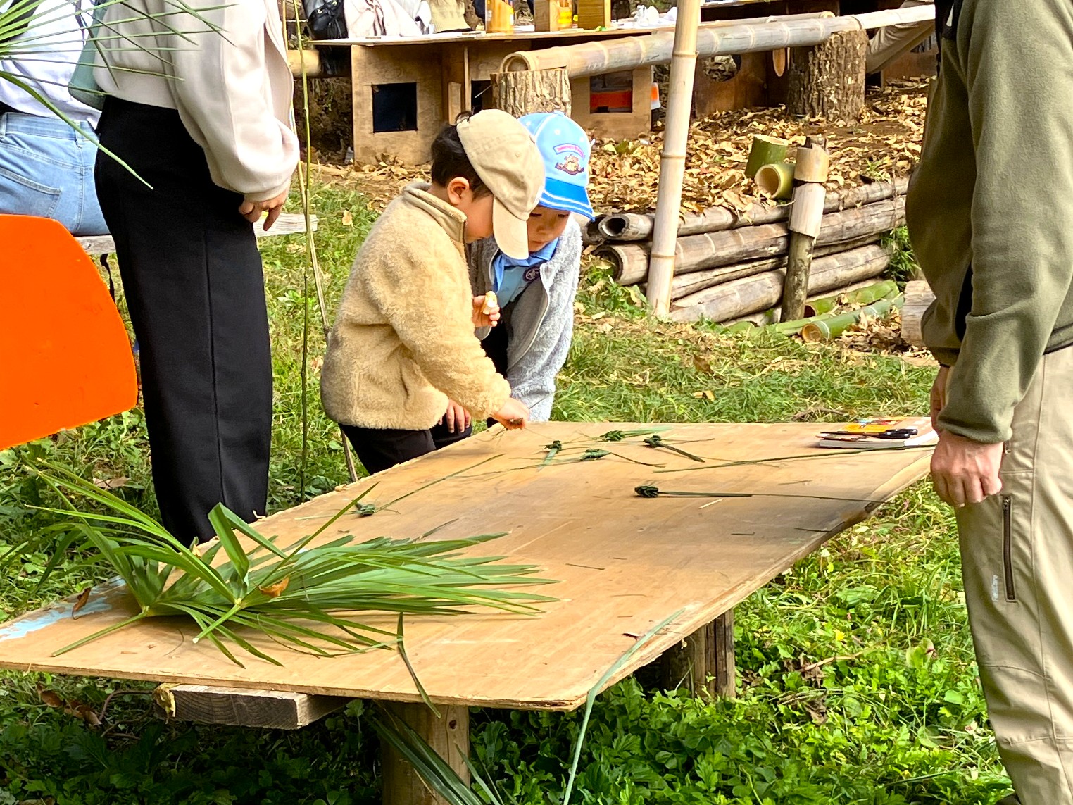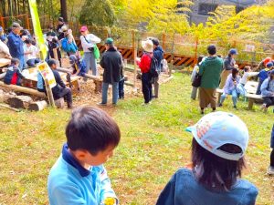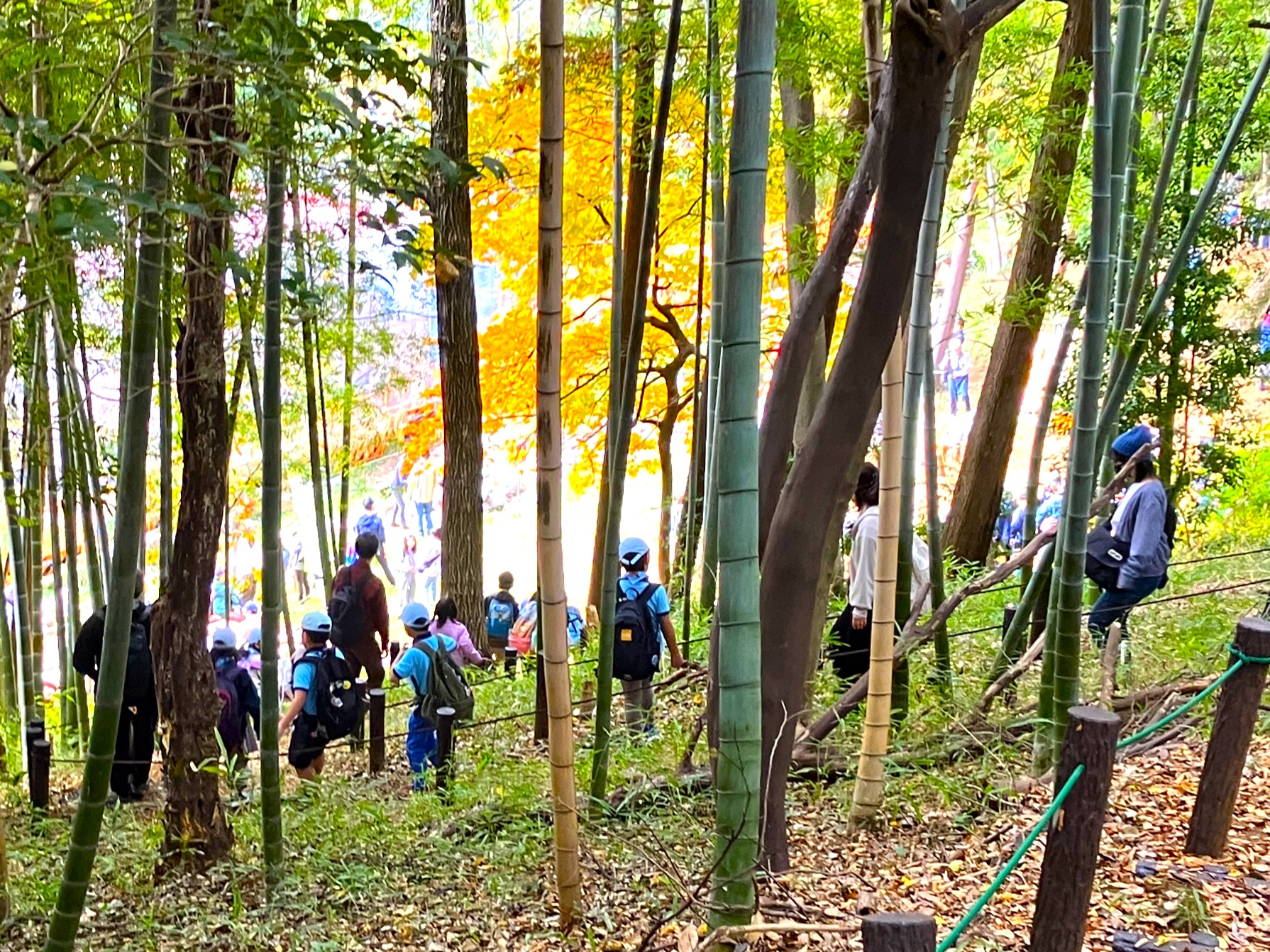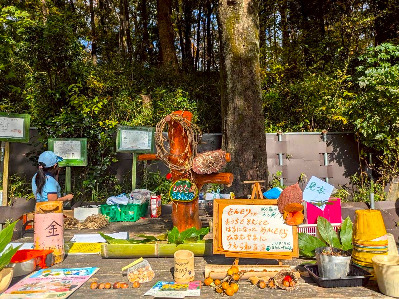 竹ばやしをあるいて「ぼっこ広場」にやってきました。きょうは「日向山うるわし会」のイベントの日だよ。