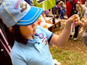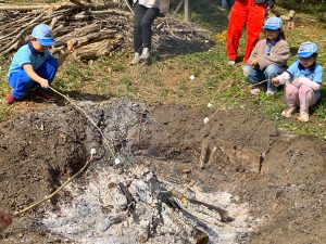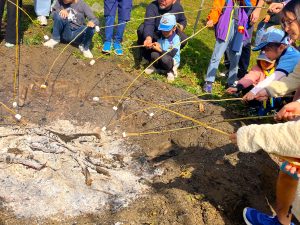 竹の先にマシュマロさして、焼いてたべよう。焼きすぎるとまっくろになるよ!