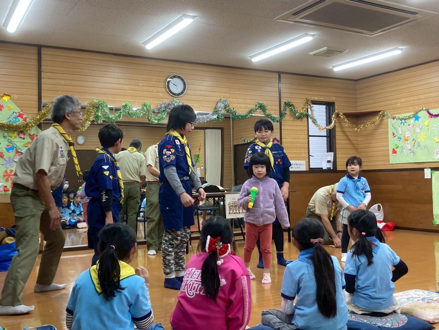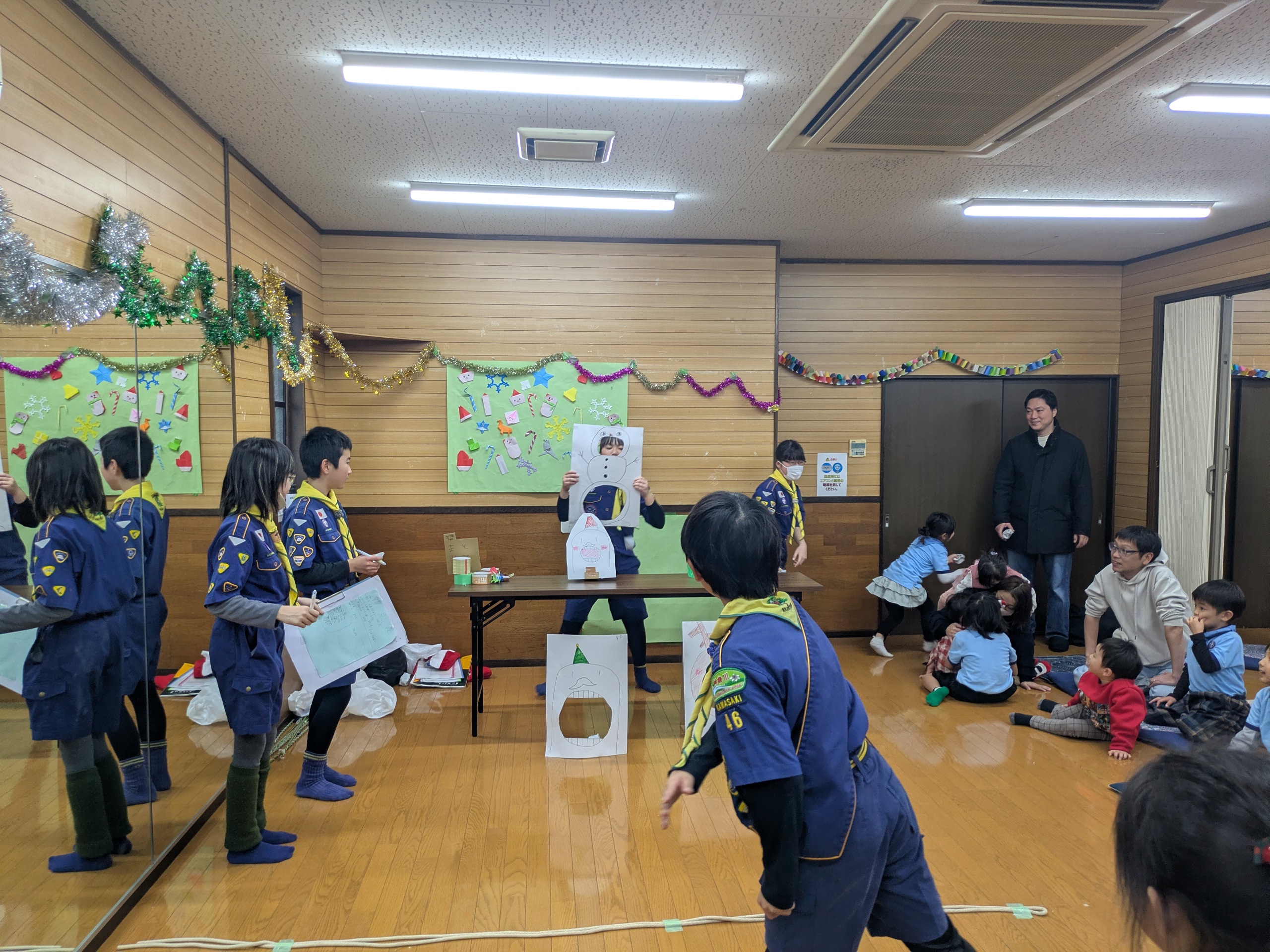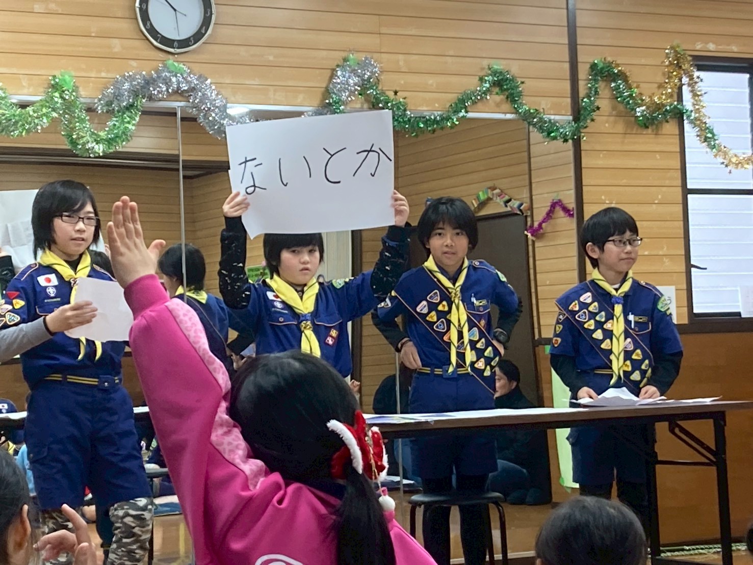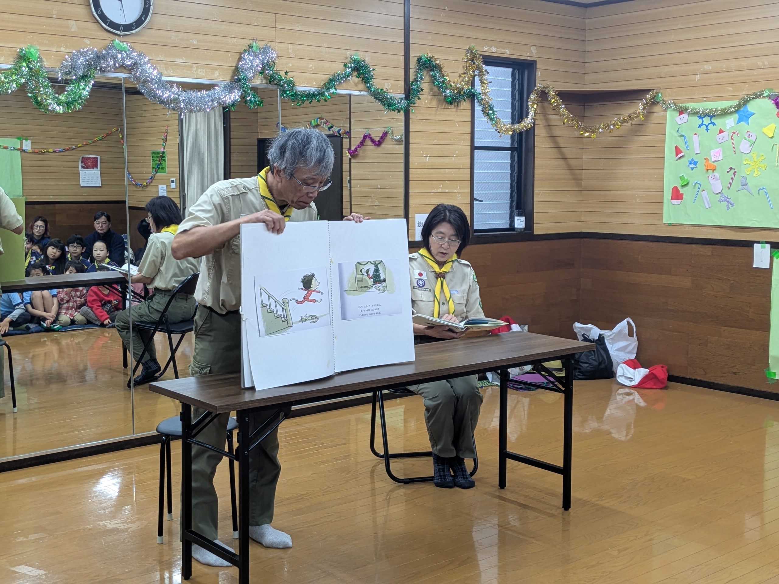 9時30分、「クリスマス会」スタートです。最初のプログラムは、ビーバー隊指導者による読み聞かせ(いちばん小さなクリスマス)です。みんな真剣に聞いていましたね。