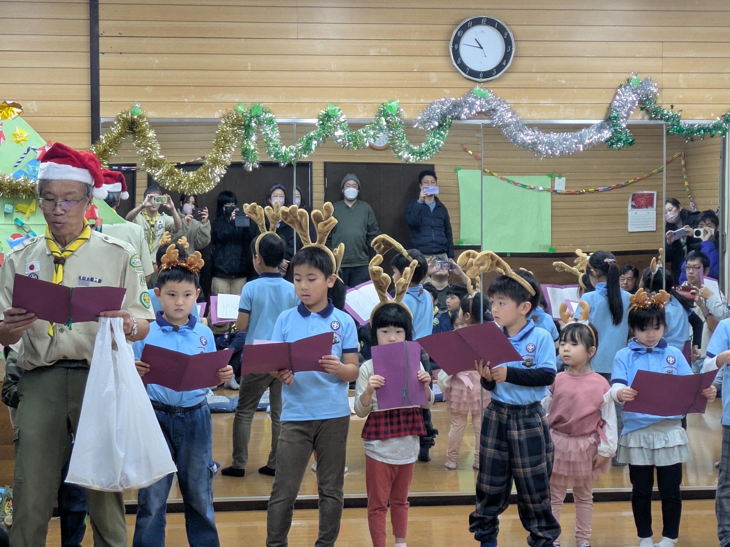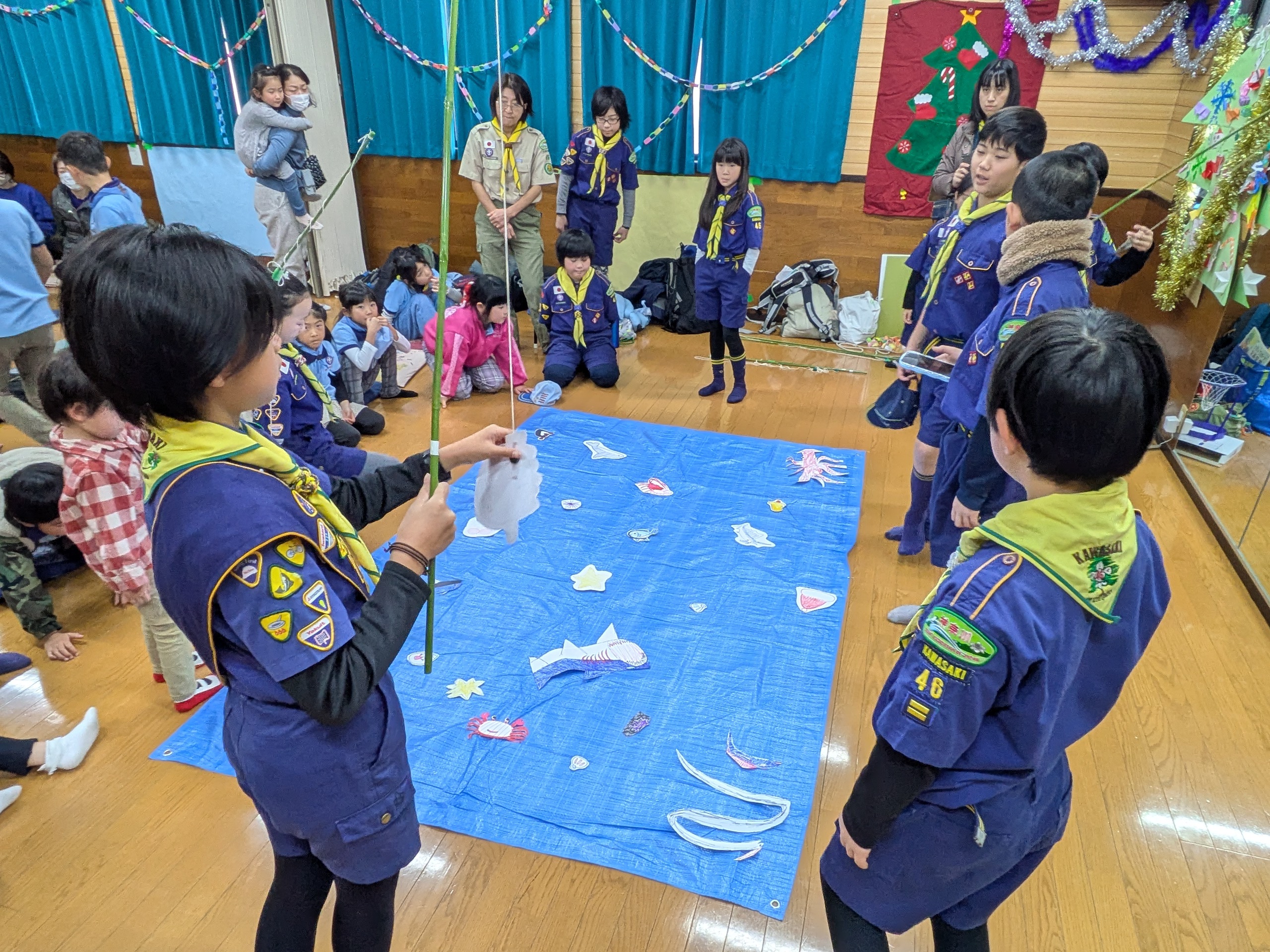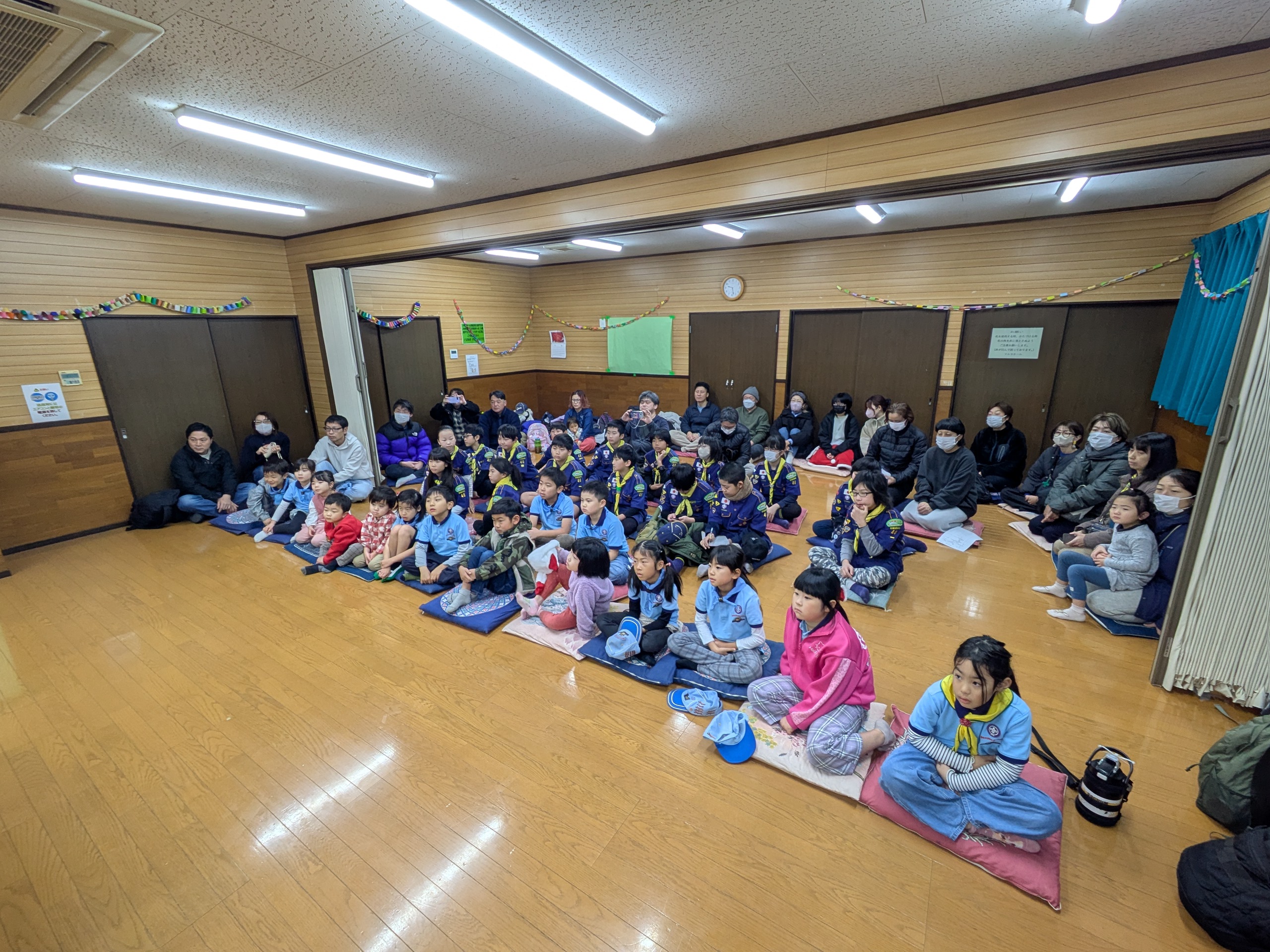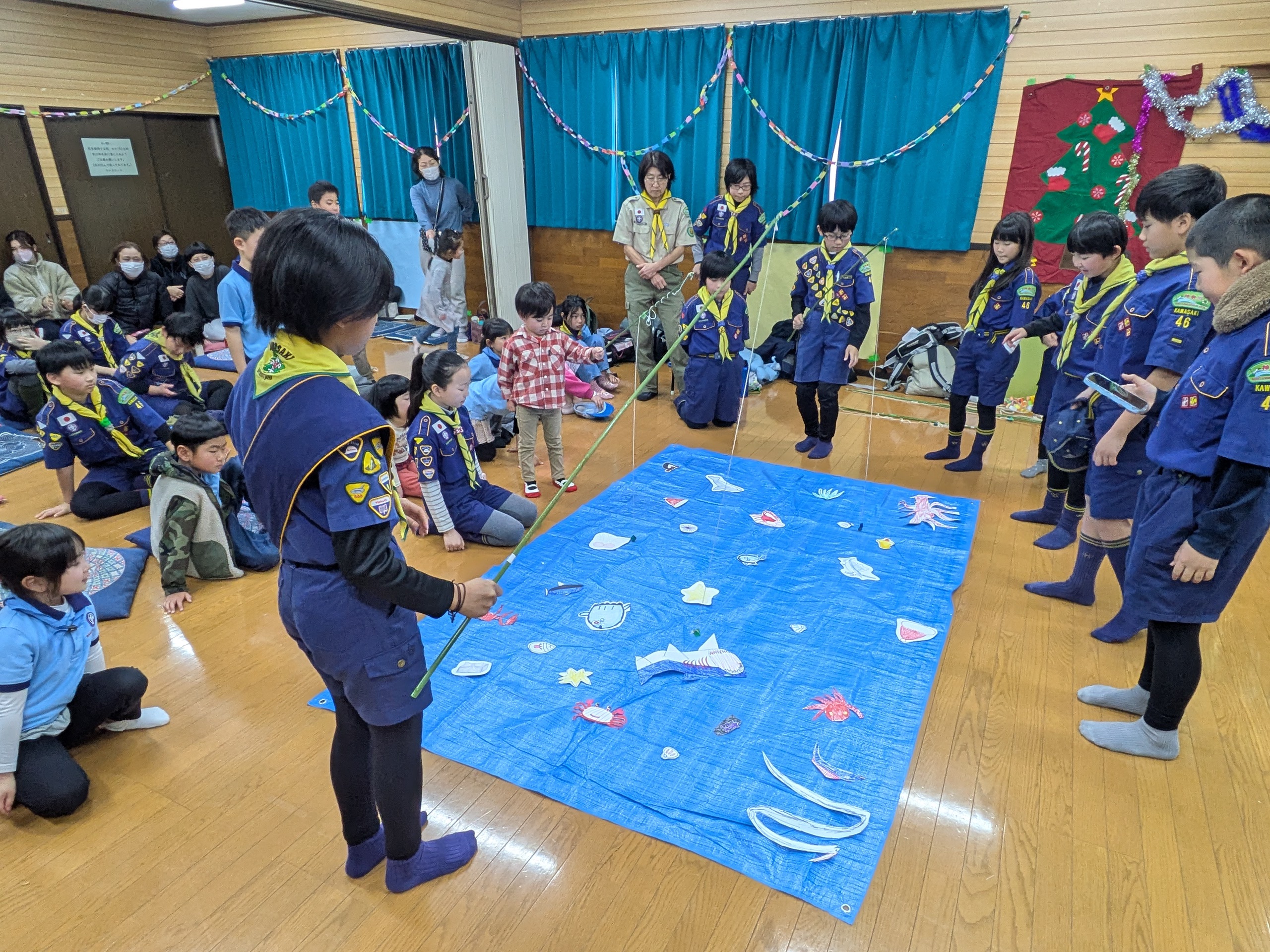 9時30分、「クリスマス会」スタートです。最初のプログラムは、ビーバー隊指導者による読み聞かせ(いちばん小さなクリスマス)です。みんな真剣に聞いていましたね。