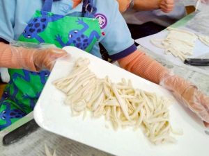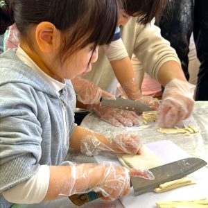 切ったら、うどんのできあがり! ながいの、みじかいの、ふといの、ほそいの、ひらたいの、いろいろできたね。