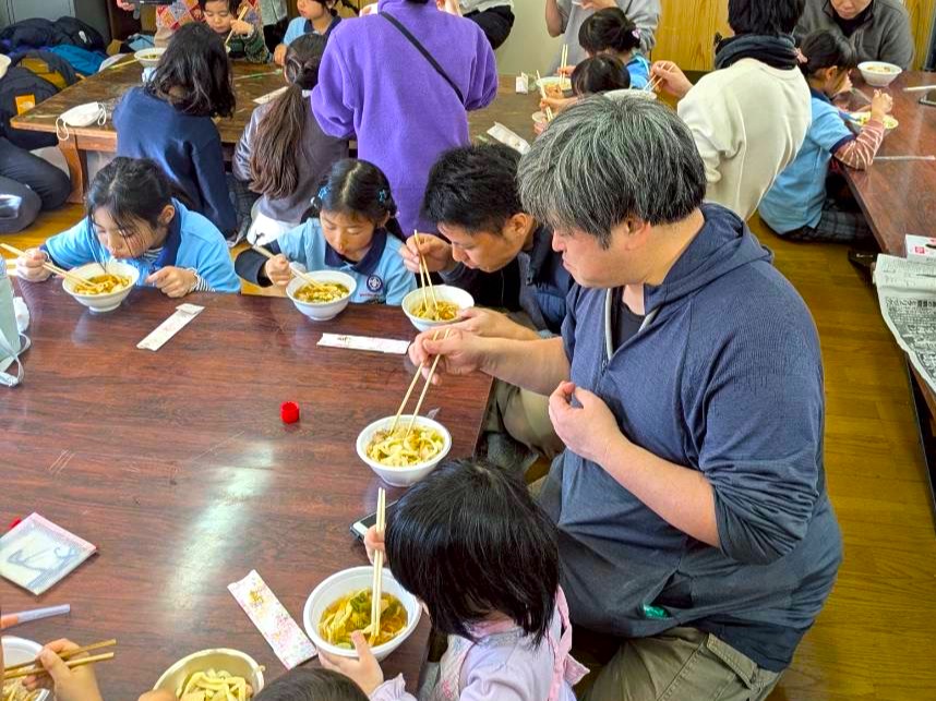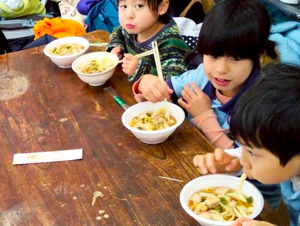 できあがったら、いただきまーす! できたてのうどん、おいしいね。