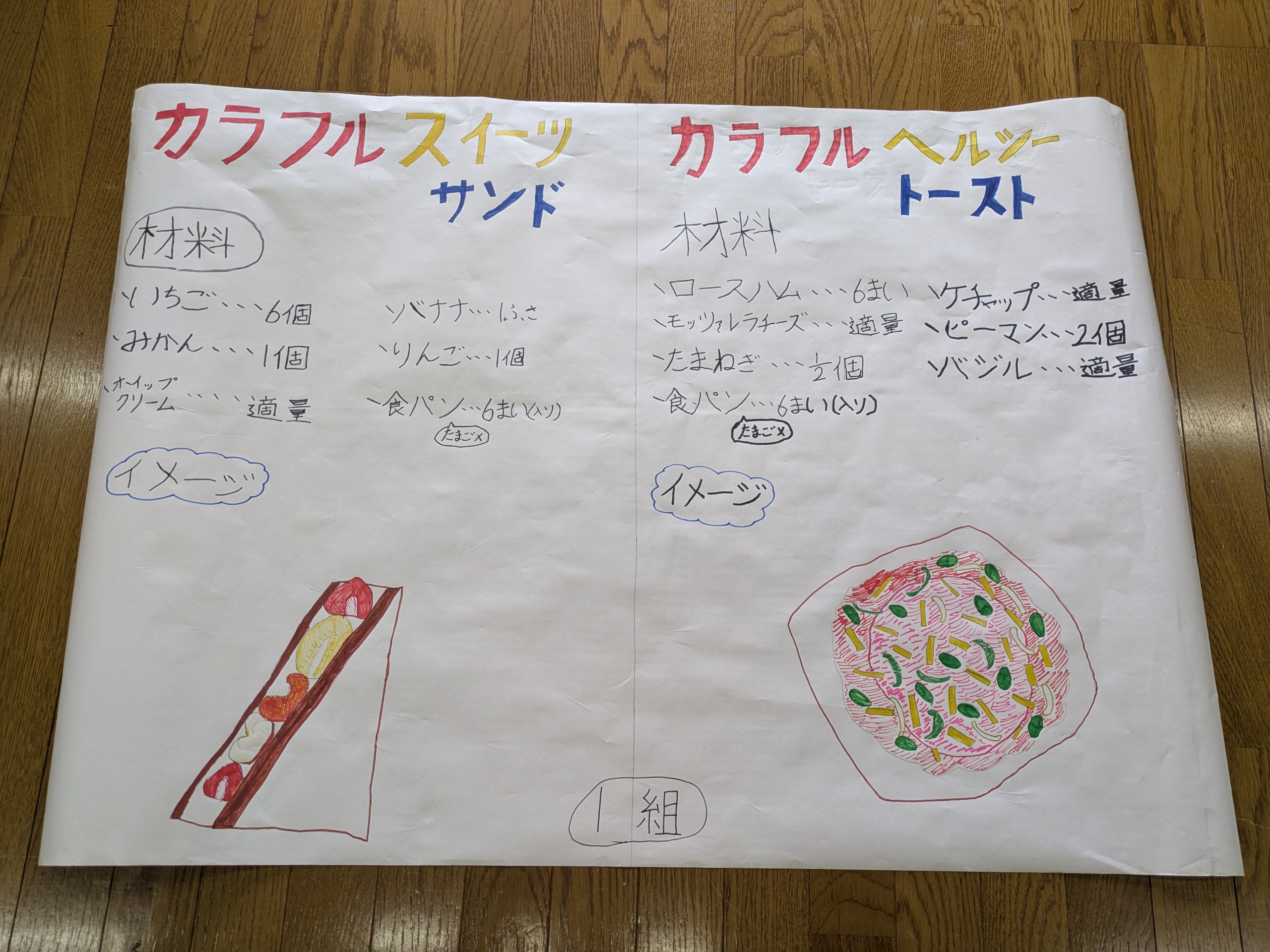続いてレシピを考えます。お題は、サンドイッチとピザトーストです。①料理名、②食材、③お客さんが来てくれそうな料理イラストを組で話し合って模造紙にまとめましょう。後で、発表してもらいます。