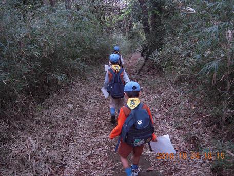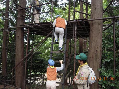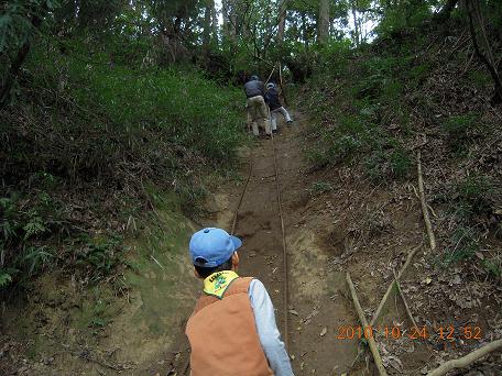ミッションF 7〜8mの崖をロープで登ります。スカウトはなんとか綱にしがみついて最後まで登りきりました。