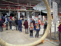 阿夫利神社についに到着。ケーブルカーを横目で見ながら、女坂 をひたすら進み、上った階段数なんと1,233段!! これから、しめなわの大輪をくぐってお参りします。 (工事中だね。) |